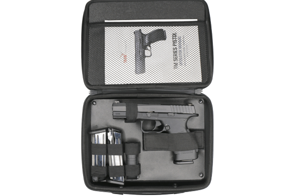 These sights are very easy to pick up. They're not night sights, but they do have a nice little, I guess you could say glow to them, but they're not night sights. They're easy to pick up during daytime. And if I put my hand over it you can't really make them out other than just being white. Which is still easier in a low light situation compared to like just a regular black iron sight or whatever else, but having those little inserts that are there. That's nice. I like it. Also too, the disassembly of the firearm requires you not to pull the trigger. A lot of firearms, we know like with Glock, things like that, you have to pull the trigger and then you're able to release the slide. This case, you don't have to do that. Once you've got it locked back to the rear here, it's flipped a switch and it just comes apart. Easy day. Easy enough. Now, a couple of other things that they've done that it's pretty smart is they left this big old gap right here towards the front of the grip. Now what's that there for? Notice the magazines too, have a nice little lip for the base plate. So if your mag ever gets to the point where it's stuck, or you have some sort of malfunction like that, you have the ability to just grab hold of this guy. And it gives you a lot of surface area to grab and rip this thing out of there and able to feed another mag if your [inaudible 00:06:25] mag fails you or whatever it might be. Other cool thing is, is in the case that it comes with, it's a nice little carry case. It does come with three 17-round magazines. That is definitely cool because, well, I like capacity. That goes into the entire debate of like 9 mil versus .45, things like that. It's like, "Hey, is .45 better than 9 mil? Yeah, sure. But I'd rather have 17 rounds of 9 mil than 8 rounds of .45." So, to each their own. I'll see you guys down in the comments section about that. But again, the Montenegrin company, TARA, has come out with this pistol. Polymer frame, steel slide, nice low-bore access.