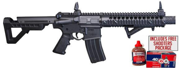 CO2 Powered, .177 Caliber rifles. These tactical BB Guns come with a free Shooters Package at Classic Firearms. The Shooters Package includes a 40 count Crosman CO2 Cartridge pack and 6000 BB's! This BB Gun has realistic weight and functions and can be fired in semi-automatic or a full auto mode. Available a few packages: FDE w/Flip-Up Sights