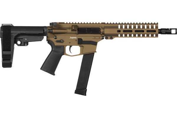 Anyway, let's move on to our next. Keeping it with the PCC class of firearms, we've got the CMMG Banshee, and this thing is a heck of a lot of fun to shoot. First off, Picatinny rail all the way up top, so you can go ahead and mount whatever type of optics you want. Comes with this beautiful oversized bat wing looking ambi charging handle that CMMG has, and I like it a lot. SBA3 brace on it, huge fan, but also what I really like is the operating system on this guy. It a radio delayed blow back system, and it's just so smooth to shoot, and yeah, chambered in .45. Threaded barrel. It comes in your standard .45 ACP thread pitch. So I have been able to take this guy out, shoot it suppressed a couple of times, shoot it unsuppressed. And I just love it every time I do. So that is the CMMG Banshee. In fact, I'm pretty sure we got some footage laying around of us shooting this guy, so we can take a look at that. All right. That's enough of that three rounds unsuppressed. It's kind of boring, right? And let's go ahead and give a couple of shots now through this guy. Ooh. Excited to see how this sounds. Let's go for it. I don't know about y'all, but that's pretty quiet. Let's keep going. (silence) Oh man. That's awesome. So yeah, shooting it, heck of a lot of fun. Great trigger, great grip. It's the MagPole, just standard MOE grip, which I am a huge fan of, too. And CMMG is just, they just make good stuff. That's all there is to it, all right?Oversize mag release, takes Glock mags. Everything you could ever ask for, am I right? So there we go.