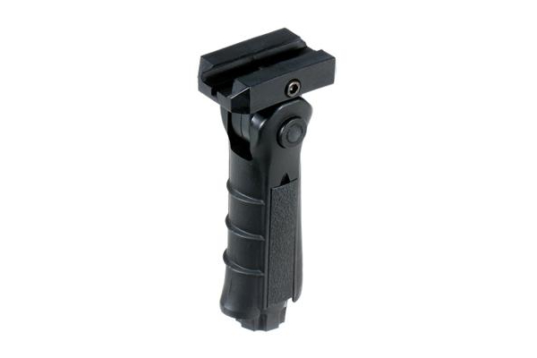 Leapers Inc UTG Foldable Adjustable Foregrip has a slide-on mounting deck, finger grooves, and an end cap for battery storage. These are super nice and fit any type of weaver rail for weaver style forearm rail system. The image above shows an AR-15 but works equally well on AK-47 rifles or any rifle with a Weaver rail on the foregrip. Will lock up on aluminum or polymer. Easy on and off.