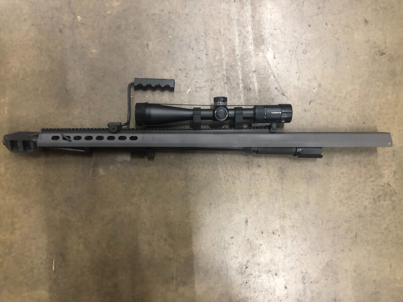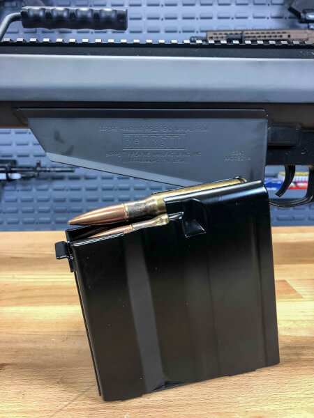 The M82A1 being artsy. The Barrett M82A1 in front of "normal firearms." The market is saturated with 5.56 NATO modern sporting rifles, making even .30 caliber rifles seem big-bore these days. Intermediate calibers like 5.56 NATO satisfy the needs of most people. However, sometimes folks just need more and .50 BMG (Browning Machine Gun) gives shooters much more power and has done so for nearly a century. Detachable 10 round box magazine. Created by John Browning at the end of the Great War, the .50 BMG round fed the M2 heavy machine gun. The Great War prompted gun manufacturers to design bigger ammunition due to the increasing presence of armored vehicles on the battlefield. Machine guns in the .30 caliber range could not penetrate vehicles protected in armor. The .30-06 round served as inspiration for Browning's .50 BMG caliber. The half-inch, high-velocity bullet provided better armor defeating capability. The .50 BMG brought an exponential power increase over standard rifle rounds and continues to dominate the battlefield to this day.