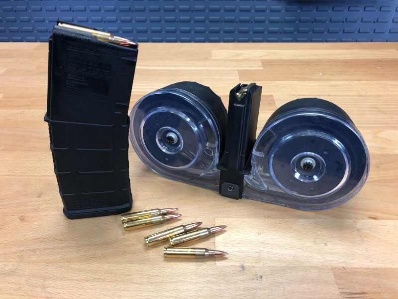 Any home defense shooting is a worst-case situation. Regardless of one's level of training or expertise, it is quite easy to miss your target under stress. To make matters more difficult, one might be up against multiple attackers. Because of the threat of more than one intruder, a larger magazine size is always appreciated. Most full-sized handguns carry 15 to 18 rounds. These handguns can carry more ammunition, but the magazine awkwardly extends well below the grip. Shotguns usually have a 10 round capacity at most. Standard capacity AR-15 magazines hold 30 rounds of 5.56 NATO/ .223 Remington and larger capacity magazines can be utilized if needed.